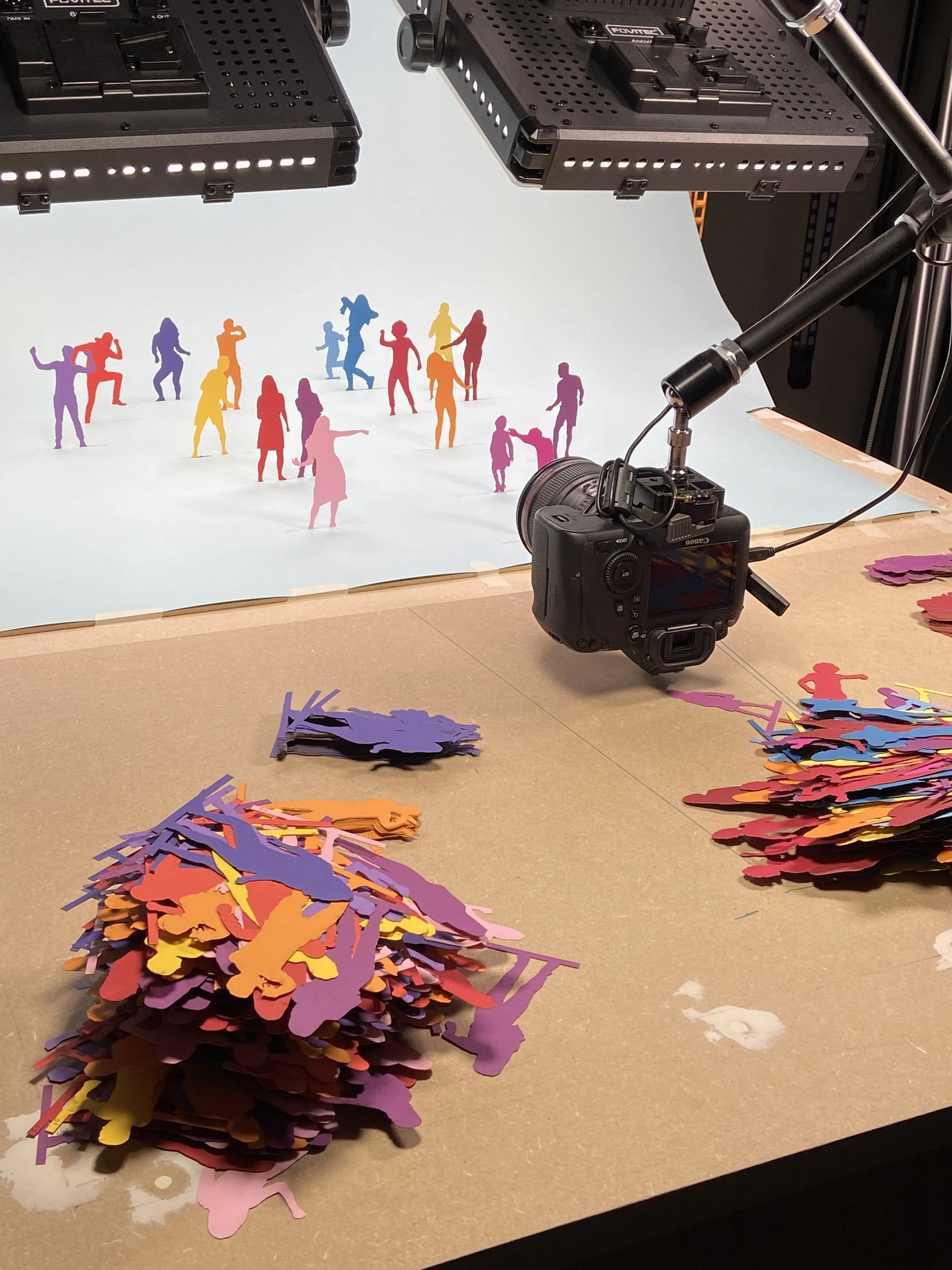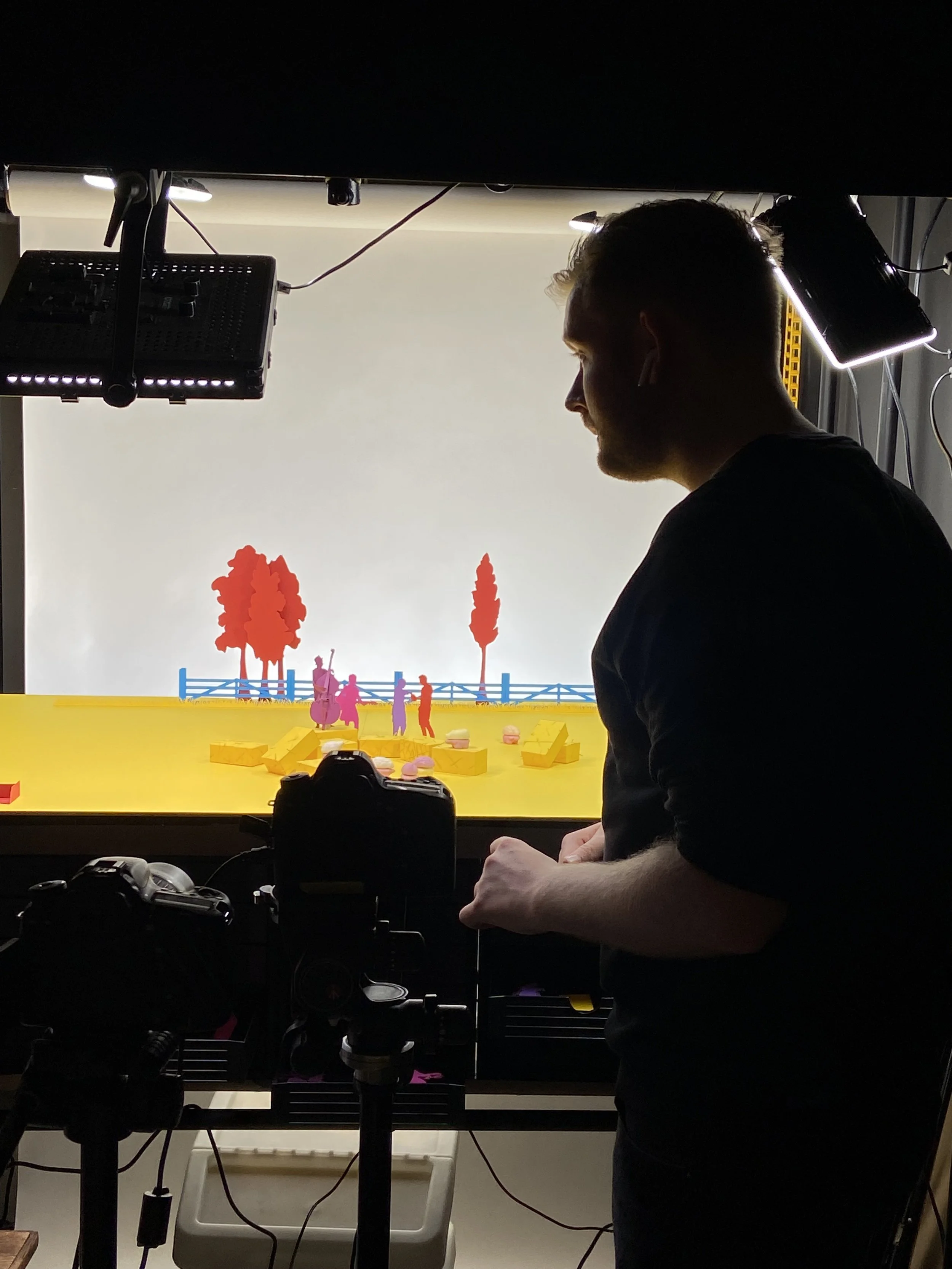 Taking an in depth look at the first scene, we started by planning the method of how we were going to “go inside” the bag of candy. For this we designed a table with a vertical board in the middle which had a square hole that the camera could fit through. From there we created an optical illusion. Replacing an actual candy bag with paper elements that, when viewed at the right angle, looked just like the candy pack.