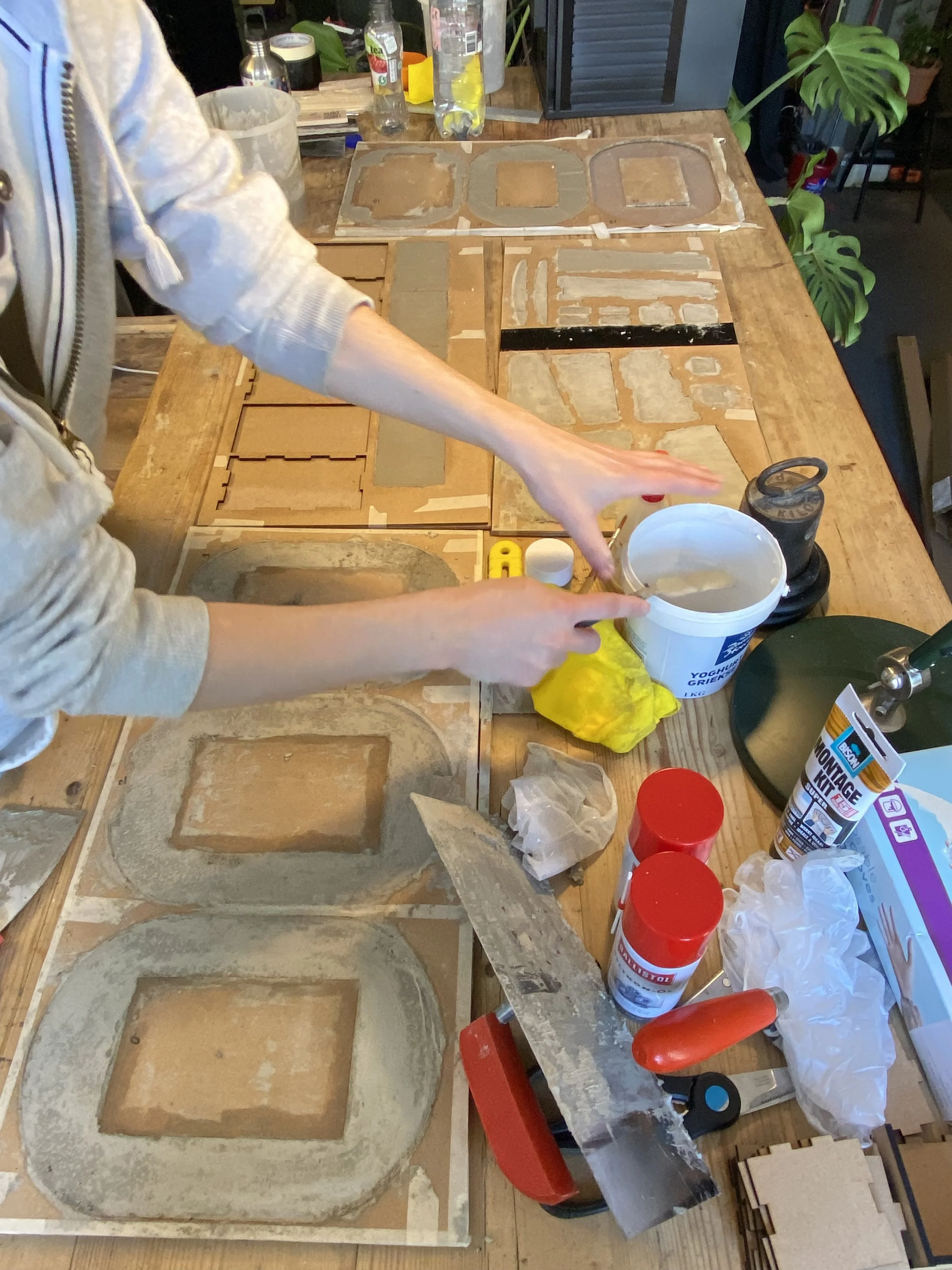 We made over 20 kg worth of cement pieces for this animation by creating rubber molds and casting building and road pieces in concrete. Then we animated it by adding cement pieces layer by layer, frame by frame to build the city.
